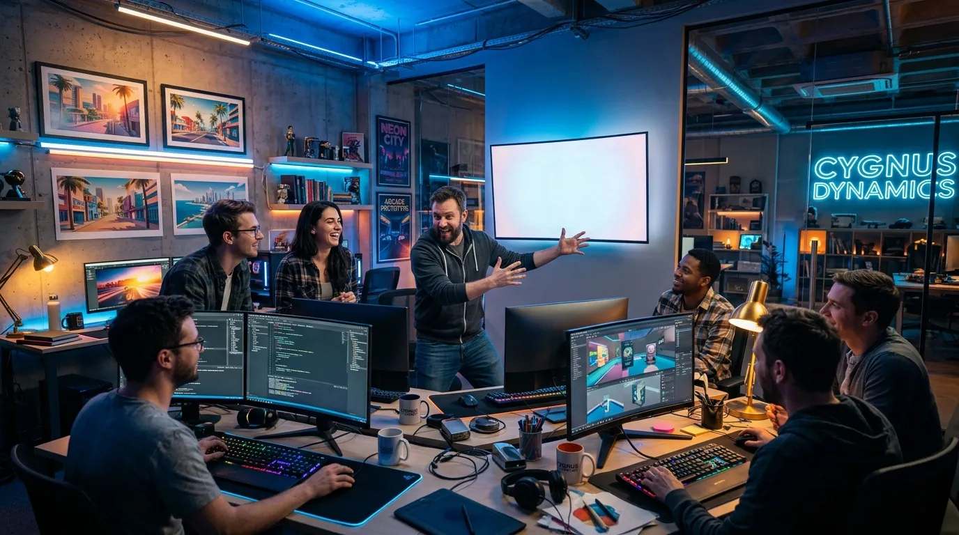 Entwickler und Designer arbeiten zusammen in futuristischem Büro